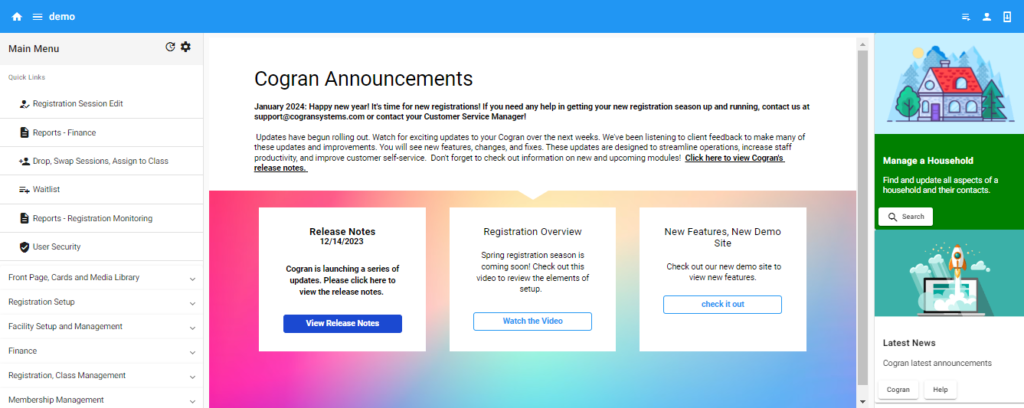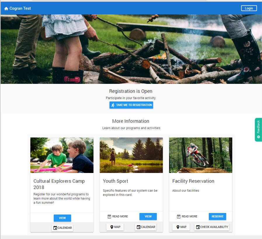 • In Cogran, registration options (such as programs, facilities, tickets, and point of sale items) include name, image, card choice, prices and discount, and eligibility. Program pricing can be impacted by quantity and household discounts, resident, or installments. Registration Options may include questions, which gather program-specific information.