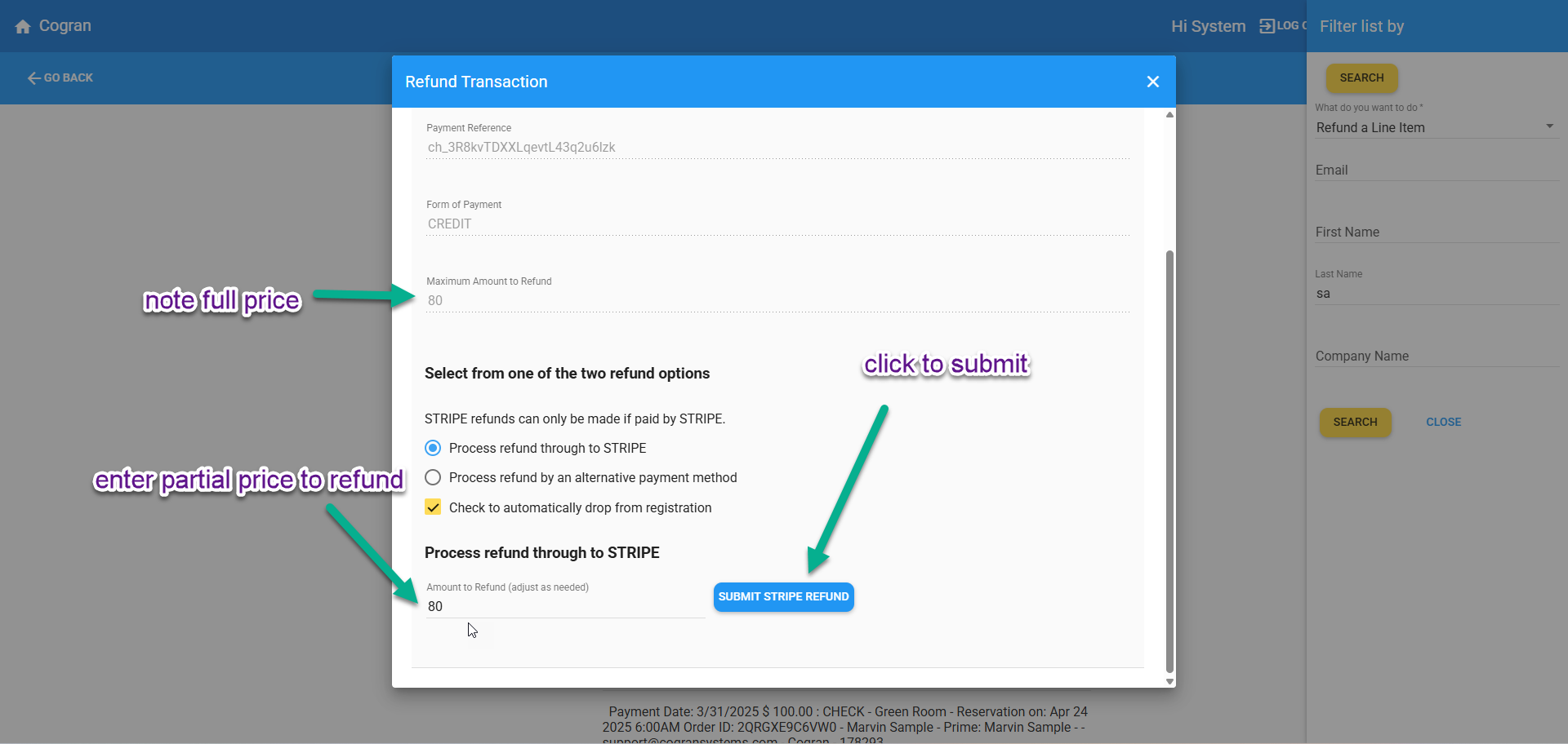 Click into the Admin Center>Select Refund a Line Item or Refund in Full.