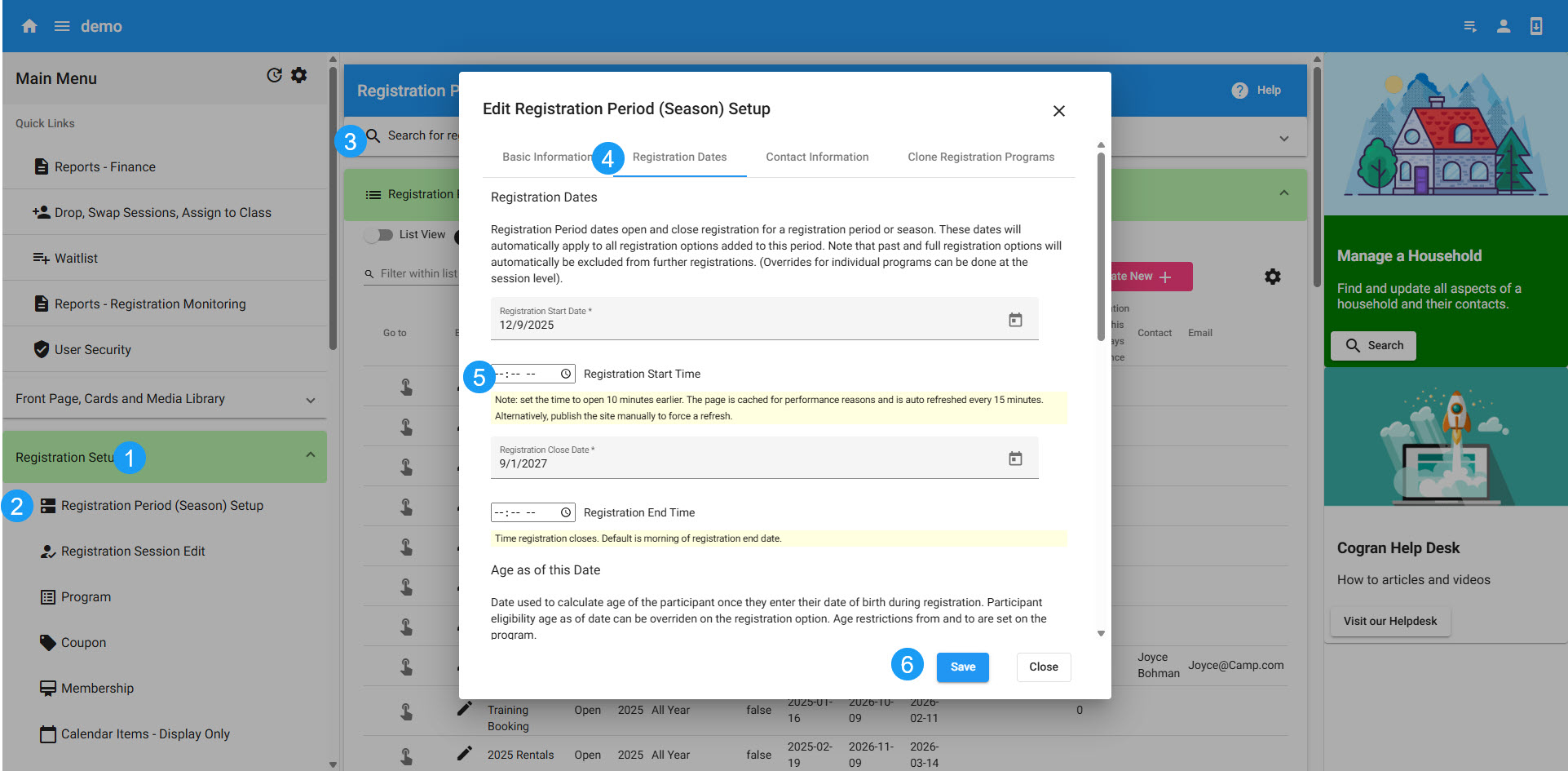 Select edit. A modal opens. Navigate to tab 2, Registration Dates.