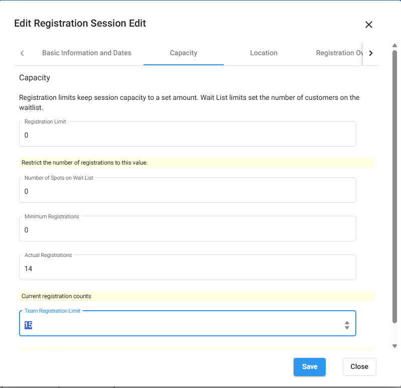 TIP: To update the number of allowed teams, change the number in the field. This will allow additional teams to register.