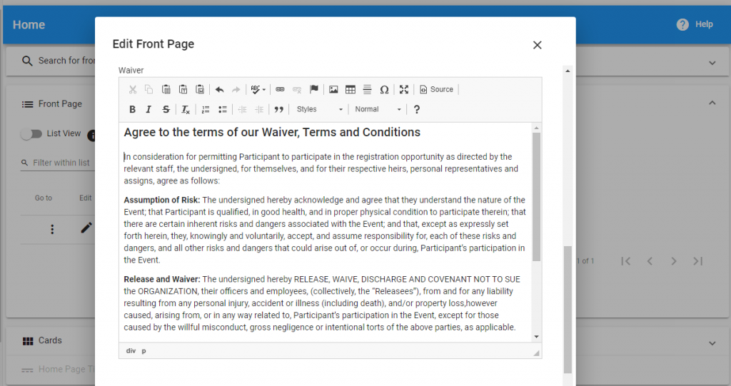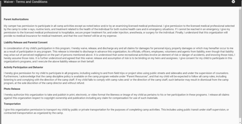 Cogran provides the option for a waiver that all account holders must acknowledge before proceeding with a registration or reservation. This waiver appears after login, and must be agreed to by the account holder (who must be older than 18) before proceeding with a transaction.